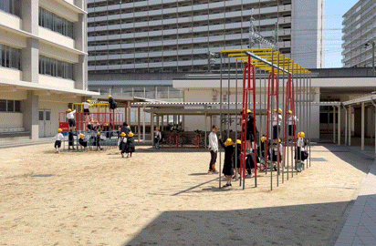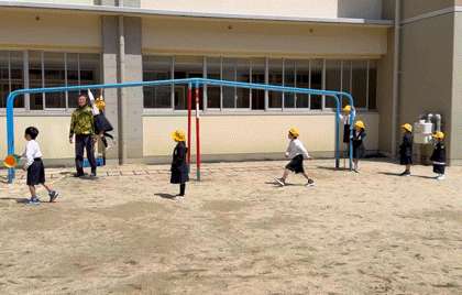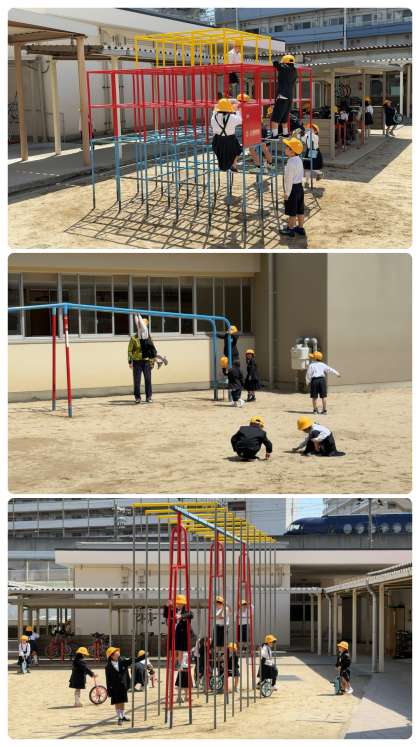 4月14日の3時間目は、体育の情業で中庭で遊具を使った運動をしました。週末は雨が続いたので、天気が良くなって、子どもたちはとてもうれしそうでした。