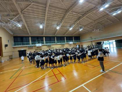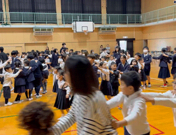 次に、全校児童でじゃんけん列車をしました。1年生のみなさんが先頭で6年生が一緒に列車を作り、となりのトトロの「さんぽ」に合わせて歩き、曲が止まったらじゃんけんです。