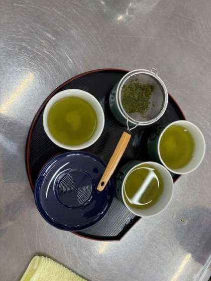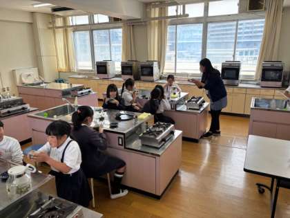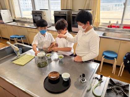 5年生は家庭科の学習に取り組んでいました。班の友だちと協力してお茶をいれていました。お茶を飲むときには、左手をお湯呑の下にして、右手を添えて美味しそうに飲んでいました。