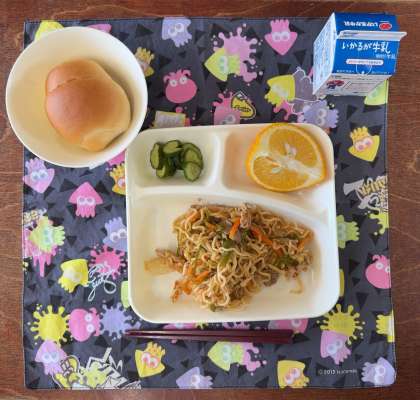本日の献立は、ミニコッペパン、焼きそば、きゅうりのしょうがづけ、あまなつかん、牛乳です。