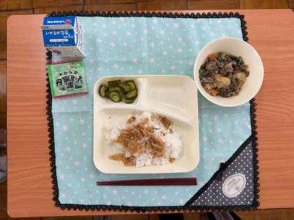 本日の献立は、ごはん、肉じゃが、きゅうりの酢のもの、ごまかかいため、牛乳です。中学生はソフト黒豆が付きます。