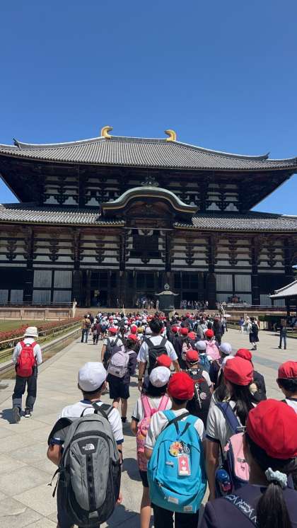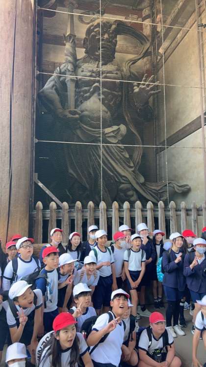 南大門が見えてきました。南大門には、金剛力士像の阿形と吽形がいます。その前で立ち止まって、大きいな、いかついなと言いながら南大門をくぐりました。