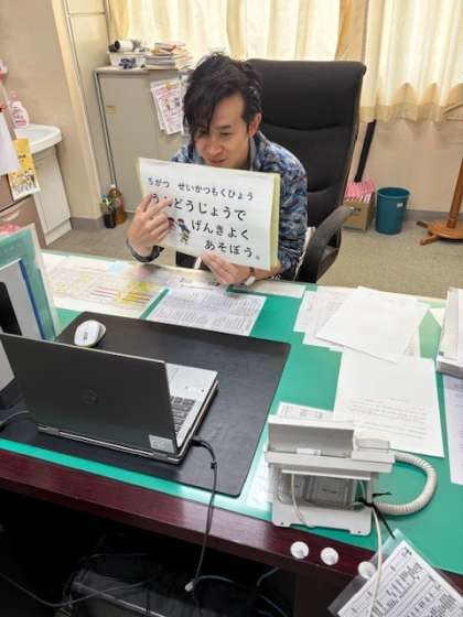 5月12月(月)の小学校全校朝会は、昨晩の雨で運動場の状態が良くなかったため、Teamsを用いてオンラインで行いました。