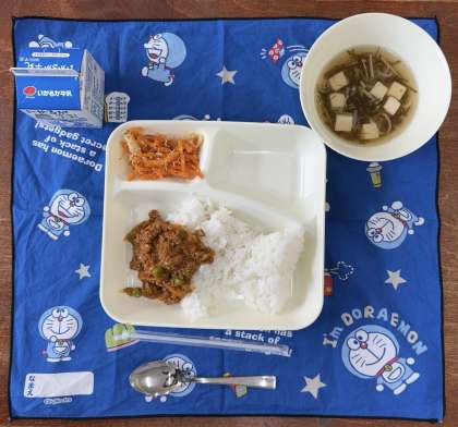 本日の献立は、タコライス、とうふともずくのとろり汁、にんじんしりしり風、牛乳です。