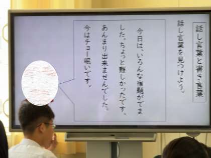 子どもたちは普段使っている言葉と、文章用の言葉の違いを比べて、話し言葉を書き言葉に直したりしました。
