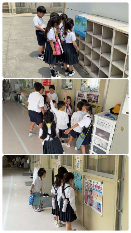 1年生のみなさんは、2年生のお兄さんお姉さんと一緒に、学校の様々な場所を回って、部屋の前に貼ってある説明とクイズに取り組んでいました。