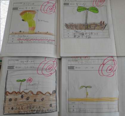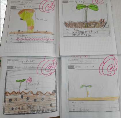 今日の様子はどうかなと、子どもたちは自分の班のホウセンカとマリーゴールドの様子などを観察して、ノートに描きました。