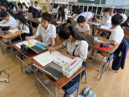 以前、学習者用端末でお互いを撮りあいました。その写真を見ながら自画像を描きました。今日は肌色を赤・黄・青の3つの色を混ぜ合わせて肌色を作り、肌を塗ることをしました。