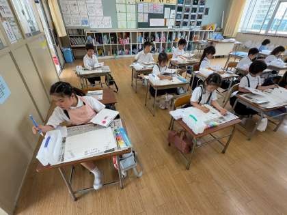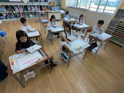 最後に、各自が好きな色を3つを選んで、水で薄め、画用紙に色を塗って筆の使い方を練習していました。