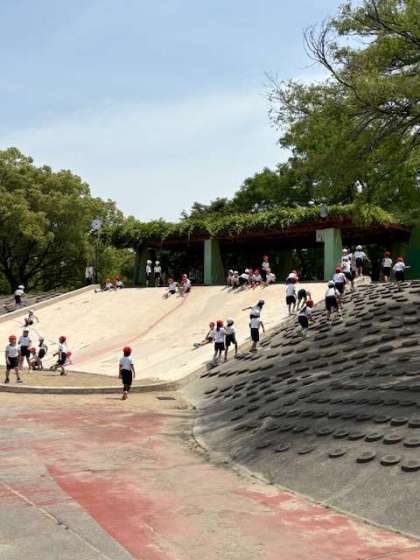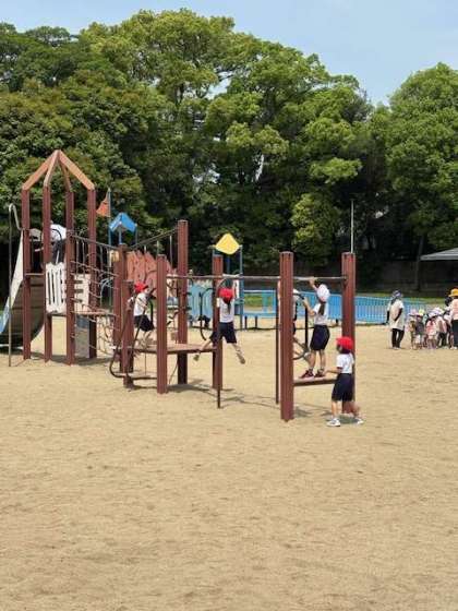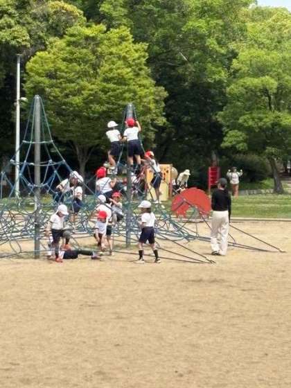 1、2年生でペアになって遊具で遊んでいます。2年生が1年生をリードしてくれています。