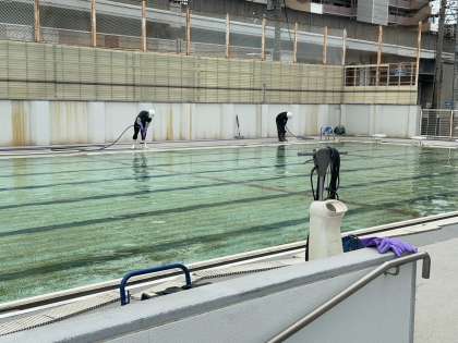 本校のプールはプールの底が上下に動き、水深を0から180センチまでかえることができます。床が正しく動作することが確認できたら、後日、プールの清掃を行います。