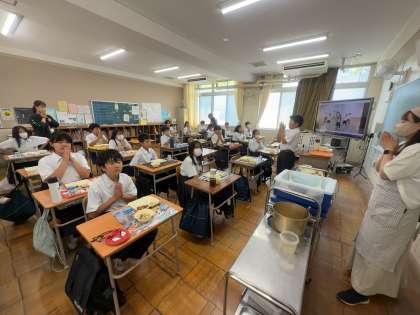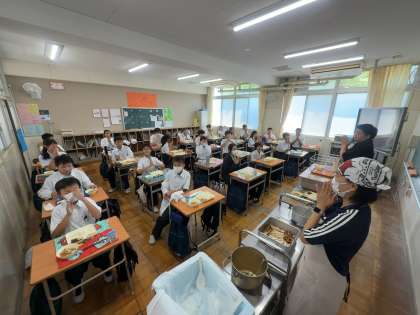 給食では、豚肉、うずら卵、キャベツ、たまねぎ、にんじん、たけのこ、ピーマン、 しいたけの8種類を使っています。