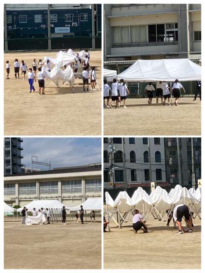 6月4日の午後、部活動の児童・生徒と教職員で明日の予行、そして日曜日の本番に備えてのテント立てを行いました。日差しが強く、大変暑かったですが、みんなで協力した結果、約30分で作業を終えることができました。