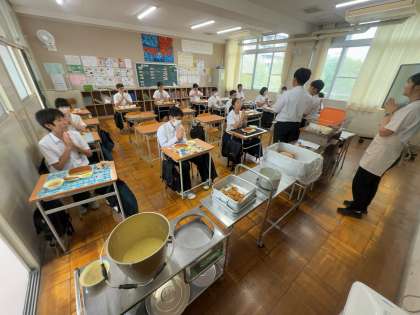 本日の献立は、ごはん、八黒糖パン、サーモンフライ、豆乳スープ、キャベツのゆずドレッシング、牛乳です。中学生は固形チーズが付きます。