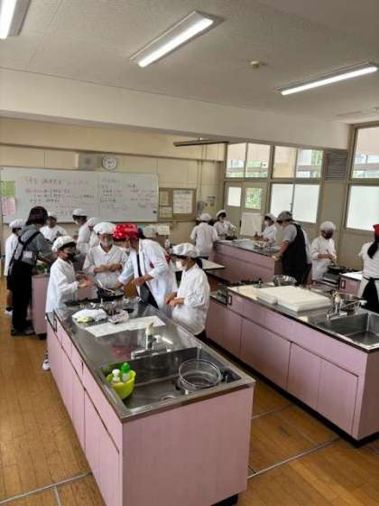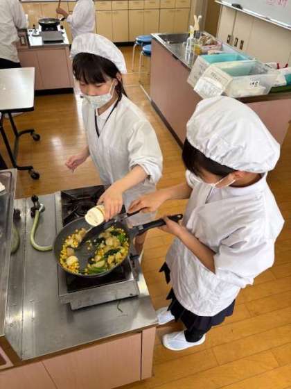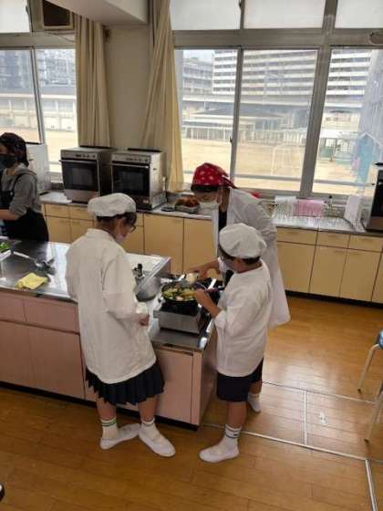 5年生は5時間目、家庭科の調理実習でした。子どもたちはグループに分かれて「ジャーマンポテト」を作っていました。友だちと仲良く味付けをしたり、食材を炒めたりと、協力して頑張っていました。とても美味しそうな香りが家庭科室いっぱいに広がっていました。