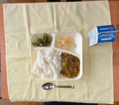 本日の献立は、和風カレー丼、オクラの甘酢あえ、和なしの缶詰、牛乳です。