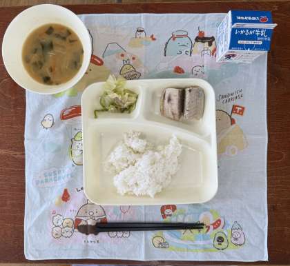 本日の献立は、ごはん、さごしのおろしじょうゆかけ、みそ汁、野菜いため、牛乳です。中学生はおさつチップスが付きます。