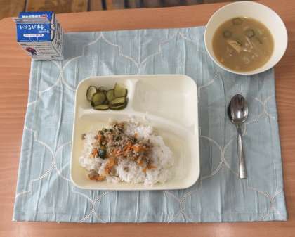 本日の献立は、豚ひき肉とにらのそぼろ丼、みそ汁、きゅうりのゆず風味、牛乳です。
