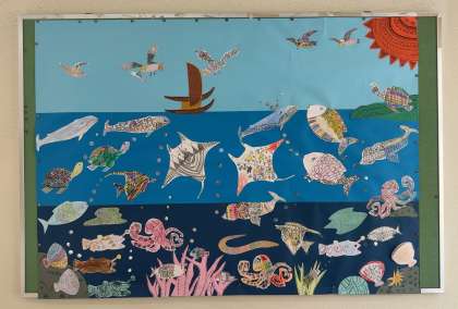 ギラギラした太陽が夏の暑さを上手に表現しています。夏休みを感じることができます。また、海の生き物がたくさんいて、涼しさも感じることができる素晴らしい作品です。