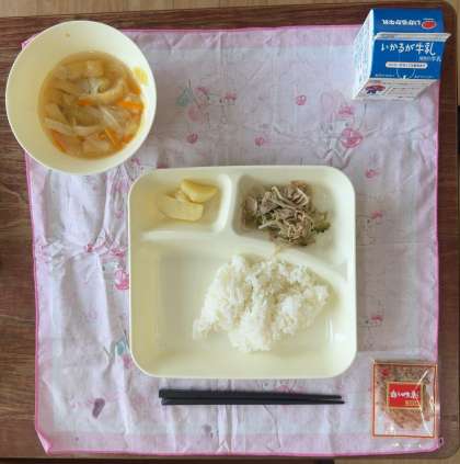 本日の献立は、ごはん、ゴーヤチャンプルー(かつおぶし)、五目汁、焼きじゃが、牛乳です。