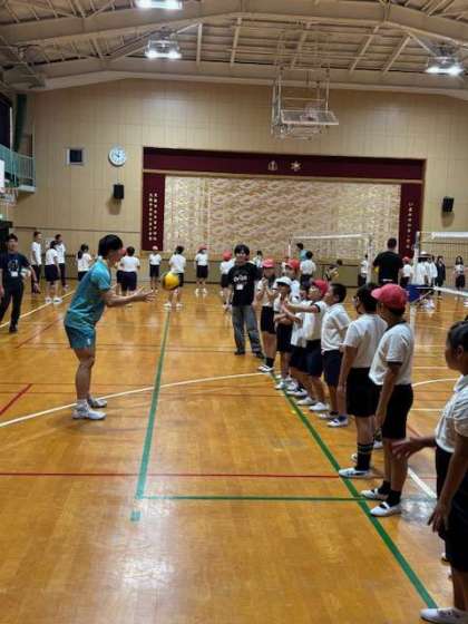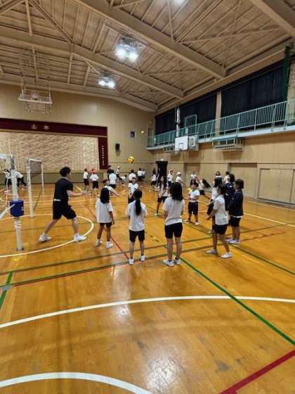 クボタスピアーズ男子バレーボール部をお招きして、「夢、授業」を行いました。子ども達は選手の皆さんから、オーバーパスや、アンダーパス、そして、アタックを教えていただきました。その後、グループに分かれて、一分間でボールを何回パスできるか、チャレンジしていました。20回以上パスをつなぐことができたグループもあり、とても盛り上がっていました。子ども達はバレーボールの楽しさを学ぶことができました。クボタスピアーズの皆様、ありがとうございました。