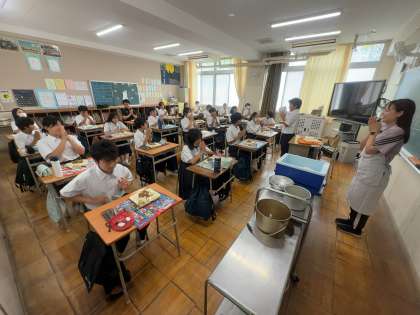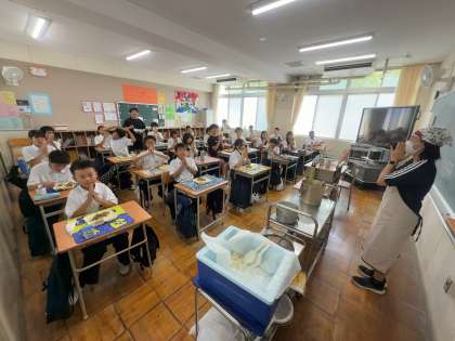 牛丼は人気のメニューの一つで、子どもたちはたくさんおかわりをしていました。また、クボタスピアーズのみなさんも何年振り?かの給食を子どもたちと食べました。クボタスピアーズのみなさん、久しぶりの給食はいかがでしたでしょうか?