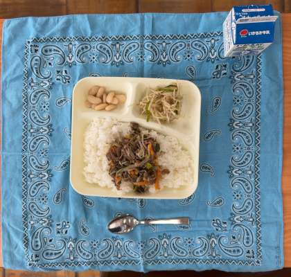 本日の献立は、牛丼、もやしとピーマンのごまいため、大福豆の煮もの、牛乳です。