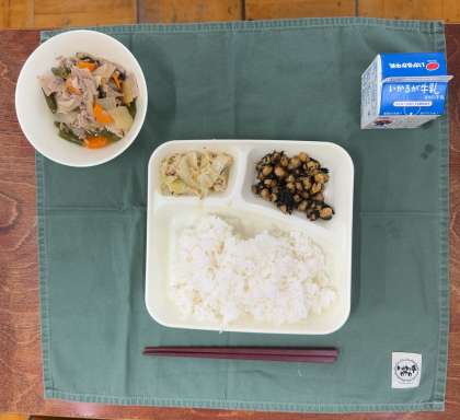 本日の献立は、ごはん、豚肉と野菜の煮もの、ひじき豆、ささみとキャベツのごまみそ焼き、牛乳です。