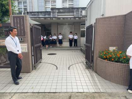 中学校の子どもたちが、元気よく挨拶運動をしています。