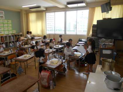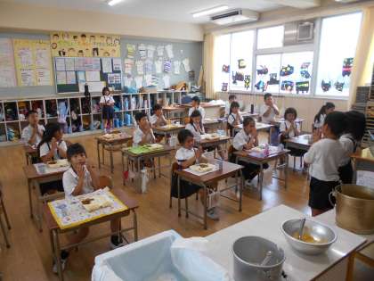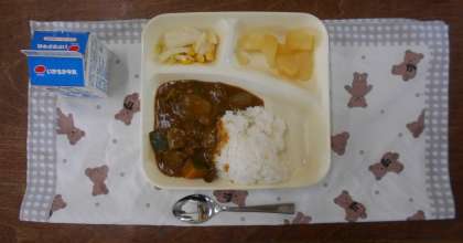 夏野菜のカレーライスは人気のメニューの一つで、子どもたちはたくさんおかわりをしていました。また、洋なしの缶詰もおいしそうに食べていました。
