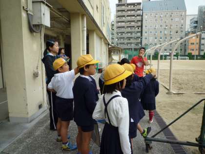 10月24日(木)に、萩之茶屋小学校の1年生3名と、2年生8名、計11名が学校見学に来ました。まずは正門で校長先生にごあいさつ。そして運動場へ。小学校と比べるととても広いので、驚いている人も。次は格技室と体育館を見学し、最後は運動場をダッシュし、広さを体感してもらいました。