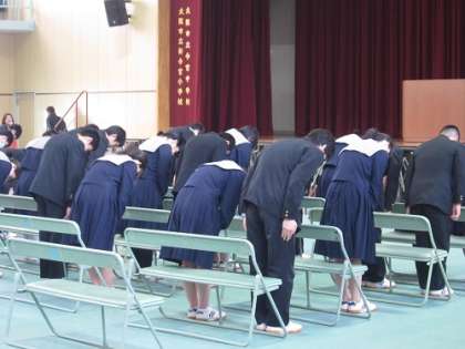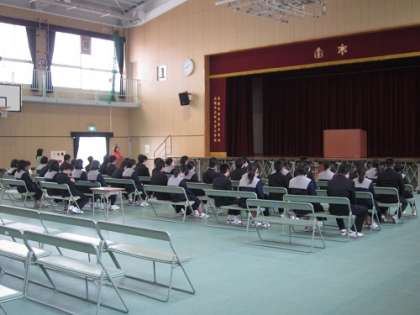 9年生の卒業式の練習が始まりました。先生の話をよく聞き、少し緊張感がある中で息の練習が始まりました。