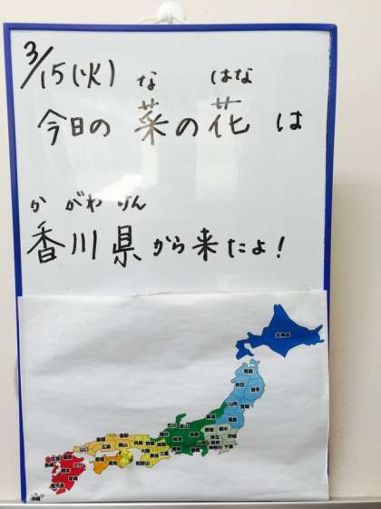菜の花のおひたしは白菜と菜の花をさっと下茹でし、砂糖・薄口しょうゆの調味液でおひたしに仕上げました。食べる時に鰹節をかけていただきます。温かい日と寒い日が何度も入れ替わるような季節ですが、菜の花の献立が登場すると、ゆっくりと春が近づいているんだなぁと実感します。