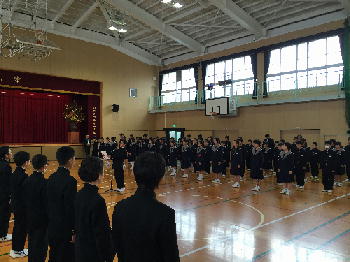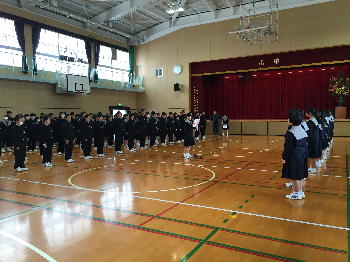 中学生だけ体育館に残り、引き続き対面式を行いました。7年生と8・9年生との対面式です。小学校の1年生を迎える集会は来週の予定です。