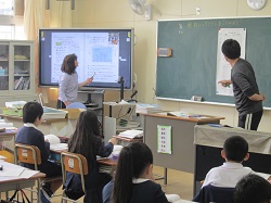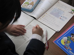 4年生の算数の学習のようです。電子黒板を使うなどして、折れ線グラフの書き方を学習しました。子どもたちは表に書かれた、時刻と気温を読み取り、グラフ上に黒い点を打っていきました。その黒い点を定規を使って線を引き、折れ線グラフにしていきました。子どもたちは黒い点を打つところを間違えないよう、グラフをよく見て書き込むことができました。
