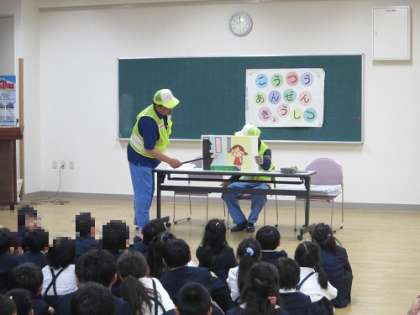 4月28日(木)、1年生の防犯・交通安全の啓発のために、ジャガパト隊と西成警察署員の方々に来ていただきました。自分のいのちを守るにはどうしたらよいのか、1年生の子どもたちにも分かりやすいように、優しい口調で話をしてくださいました。