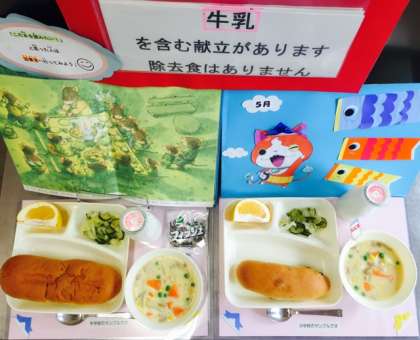 コーンクリームシチューは調理室で丁寧に炒めて作ったホワイトルゥを使い、具だくさんのコーンクリームシチューに仕上げました。野菜もたっぷり食べられる献立です。