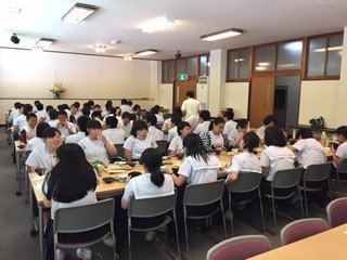 修学旅行最後の体験は、ラフティング。終了後の昼食は、みんなモリモリ食べました。