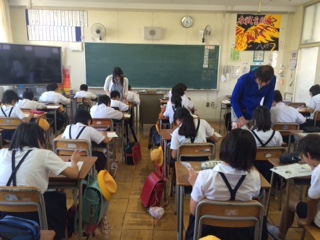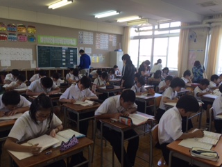 6月2日(木)の放課後、英語検定チャレンジがスタートしました。今回、参加した児童生徒は68名で、8年1組の教室がいっぱいになりました。中学生は自前のテキスト、小学生は5級レベルのプリント集を使って、勉強に励みました。静かな雰囲気の中で、一人ひとりが黙々と打ち込む姿が見られました。