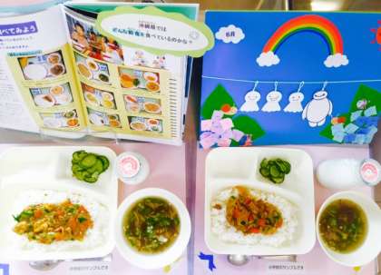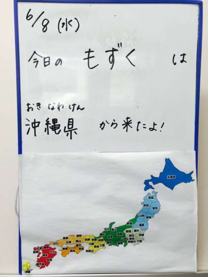 今日の本は「沖縄まるごと大百科」です。今日の給食に登場した「もずく」の産地「沖縄県」では、小学校の給食にも地元の食材がたくさん使われているそうです。写真を見ながらいろんなことを楽しく学べる本です。