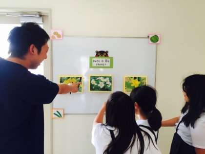 第一回目の掲示は「お花クイズ」です。写真をめくると正解がわかるようになっています。子どもたちもたくさん見に来てくれました。食べ物を通じて、いろんなことに興味を持ってほしいなと思います。