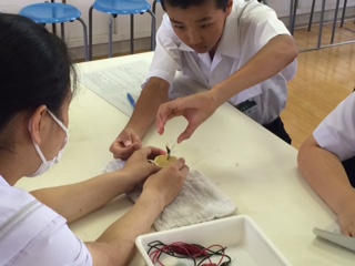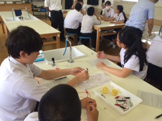 6月13日(月)、教育実習生による理科の授業研究が行われました。身の回りにあるものを使って、電池を作るという実験でした。実験ではレモンや備長炭を使いました。どうして、レモンや備長炭から電気を作り出すことができたのか、生徒たちからも不思議そうな表情を浮かべていました。