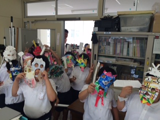 お面をかぶった子どもたちが職員室に来ました。5年生が図工の学習で作成したお面を見せにやってきました。1枚の画用紙から、形を切り抜いたり、模様を切り抜いたりしました。一人ひとり個性豊かな作品で、「見て、見て!!」ととてもうれしそうにしていました。
