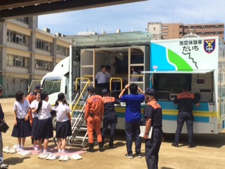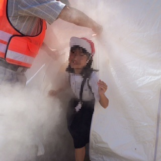 防災訓練のようすです。写真は「スモークテント体験」「起震車体験」「災害時に使用する道具の紹介」です。災害が発生したときは消防署だけでなく、警察署の方々も救出作業に参加することが分かりました。