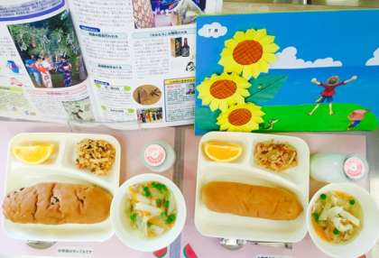 パエリアは鶏肉やイカの他に野菜もたっぷりと加えて、米と一緒に煮込んだのち、1クラスごとにバットに入れてオーブンで焼き上げました。いろんな食材がバランスよくとれる献立です。