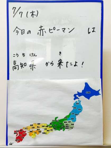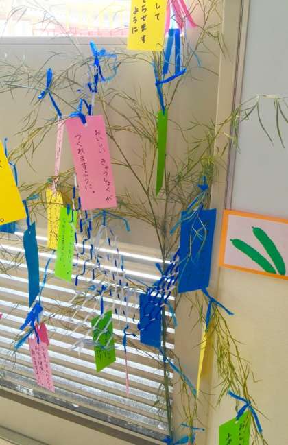今日は7月7日、「七夕」です。給食室のそばに笹がかけてあり、調理員さんが飾りつけをしてくださいました。