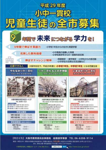 「平成29年度 児童生徒の全市募集」にかかわって、予定しております学校公開日の時間帯について、大阪市教育委員会事務局 学事課が出しているチラシ、学校案内並び西成区役所の出している学校選択制にかかわる「学校案内」などにおいて、違う時間帯が記載されているということで、教育委員会のホームページ並びに西成区役所のホームページに訂正の記事が掲載されているようです。