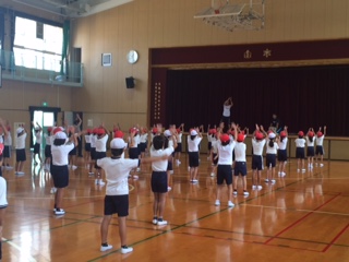小学校はプール水泳が終わり、運動会の練習が始まりました。写真は3・4年生の演技のようすです。先生の動きをよく見て、子どもたちもダンスをしていました。まだまだ、暑い日が続きます。登校する際には、汗をふくタオルや水筒を持たせてください。