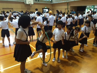 2学期になって最初の児童集会を行いました。今回はたてわり班による、フラフープくぐりです。横の友だちと手をつなぎ、その手を離さないようにしてフラフープを通していく遊びです。上手く体を動かして、フラフープをくぐっていくことができました。