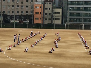 1・2年生の運動会のようすです。運動場に出て、自分の立ち位置を確認しました。これまで、体育館で練習をしていたので、友だちとの距離感も変わったはずです。何度も繰り返し練習し、自信を持って演技できるようにしましょう。